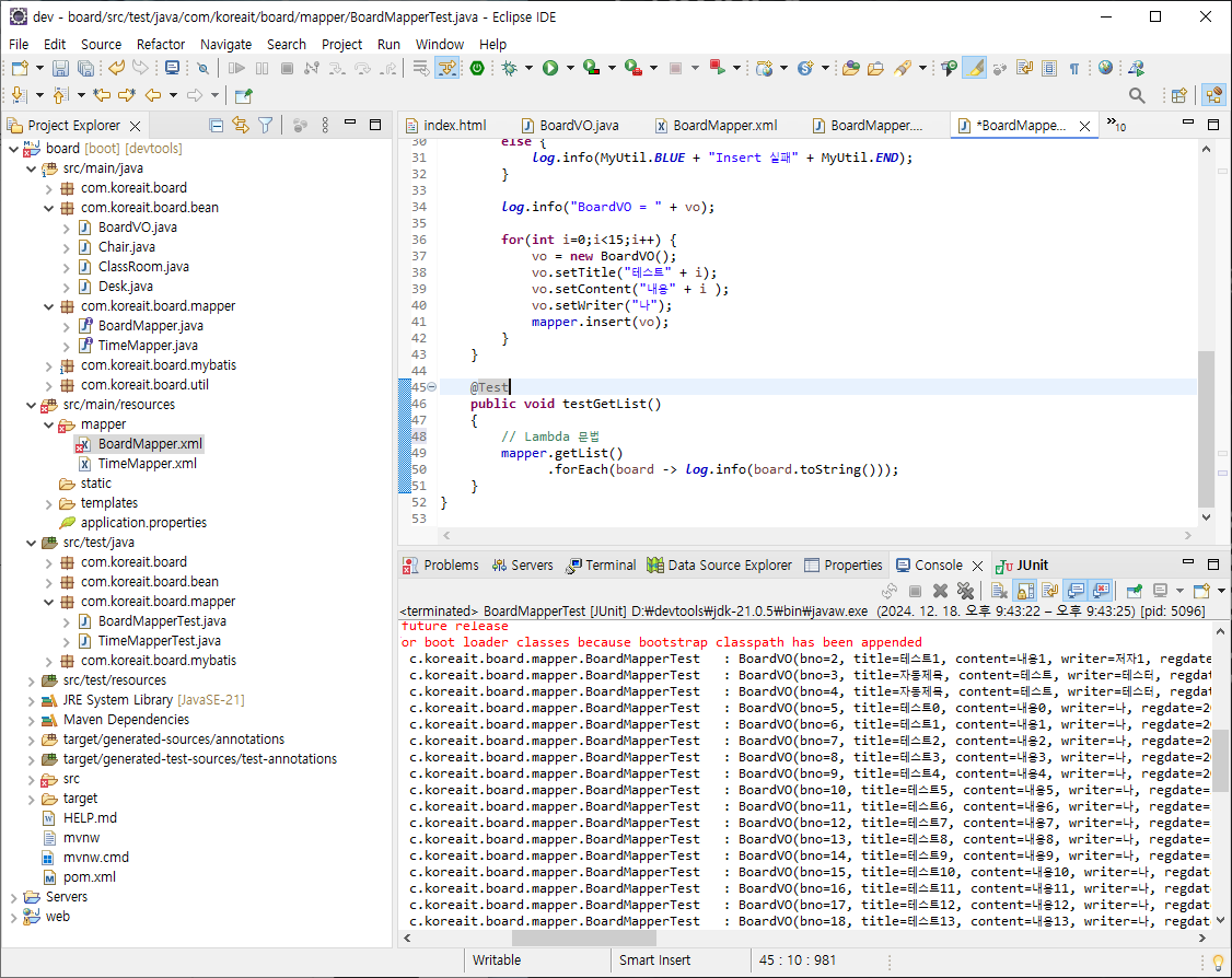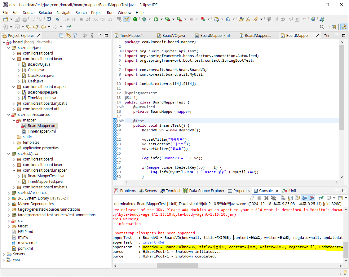 - src/test/java -> com.koreait.board.mapper 에 BoardMapperTest.java 생성